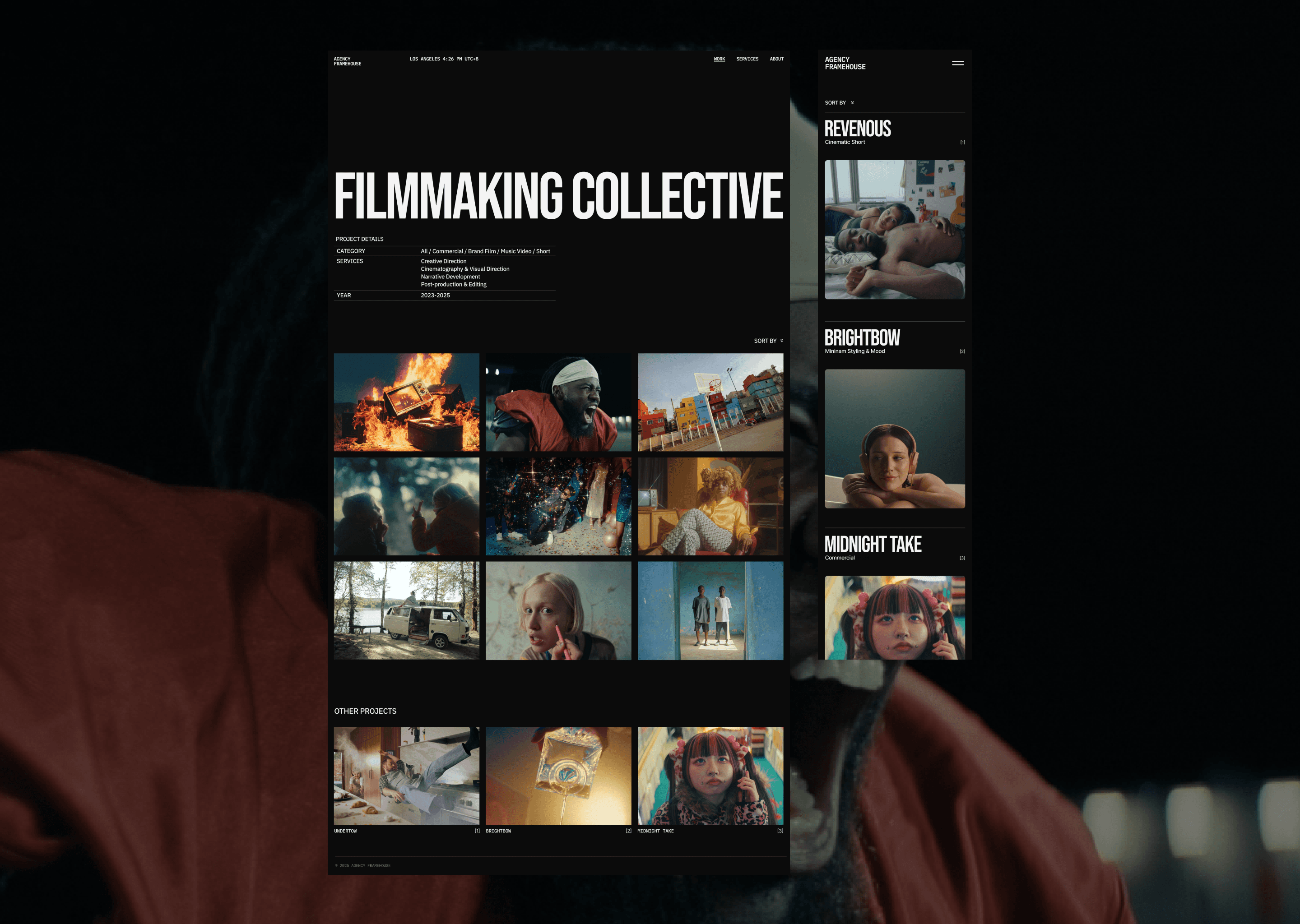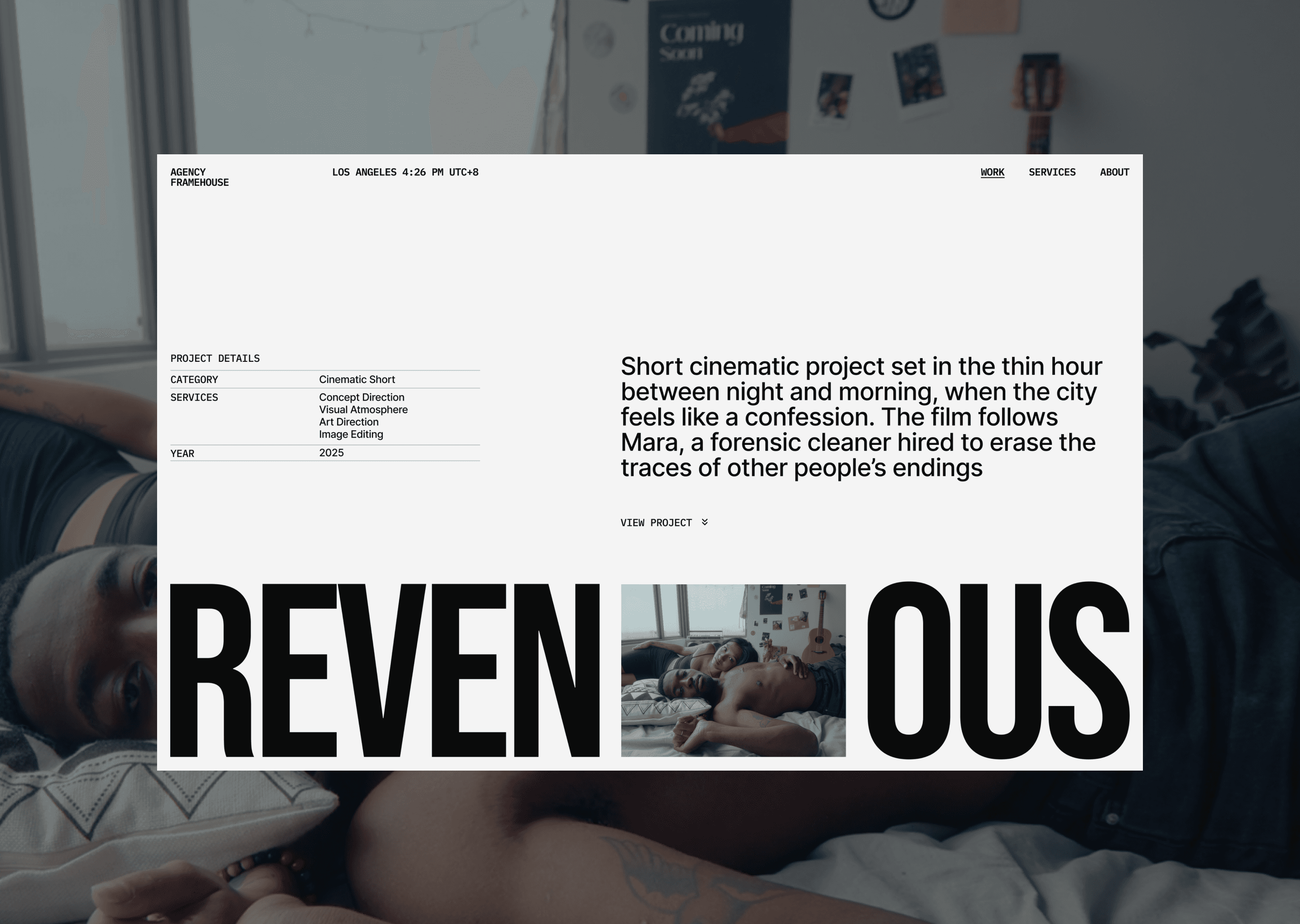 Portfolio design and interaction focused on a clean, immersive experience. A minimal layout enhances visual storytelling, with smooth navigation and intuitive transitions for seamless exploration across devices.